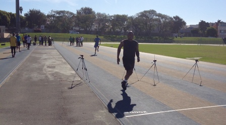 Candidates will start with one foot on the 1 meter running start line. When the instructor is ready with the gates in reset position he will set the candidate off.The candidate will trigger the start of the timer through Gate set 1. He/She will run the 40 meters and trigger the stop of the timer through Gate set 2. He/She will then walk back and join the other candidates in the back of the line to get ready for his next run. In the mean time the instructor will record the time and then reset the timer and set of the next candidate. Groups of 6 to 12 candidates can be tested so that the candidate has enough time to walk back and join the queue. Candidates must complete at least 6 of the allotted 7 runs within a given time to pass this test.